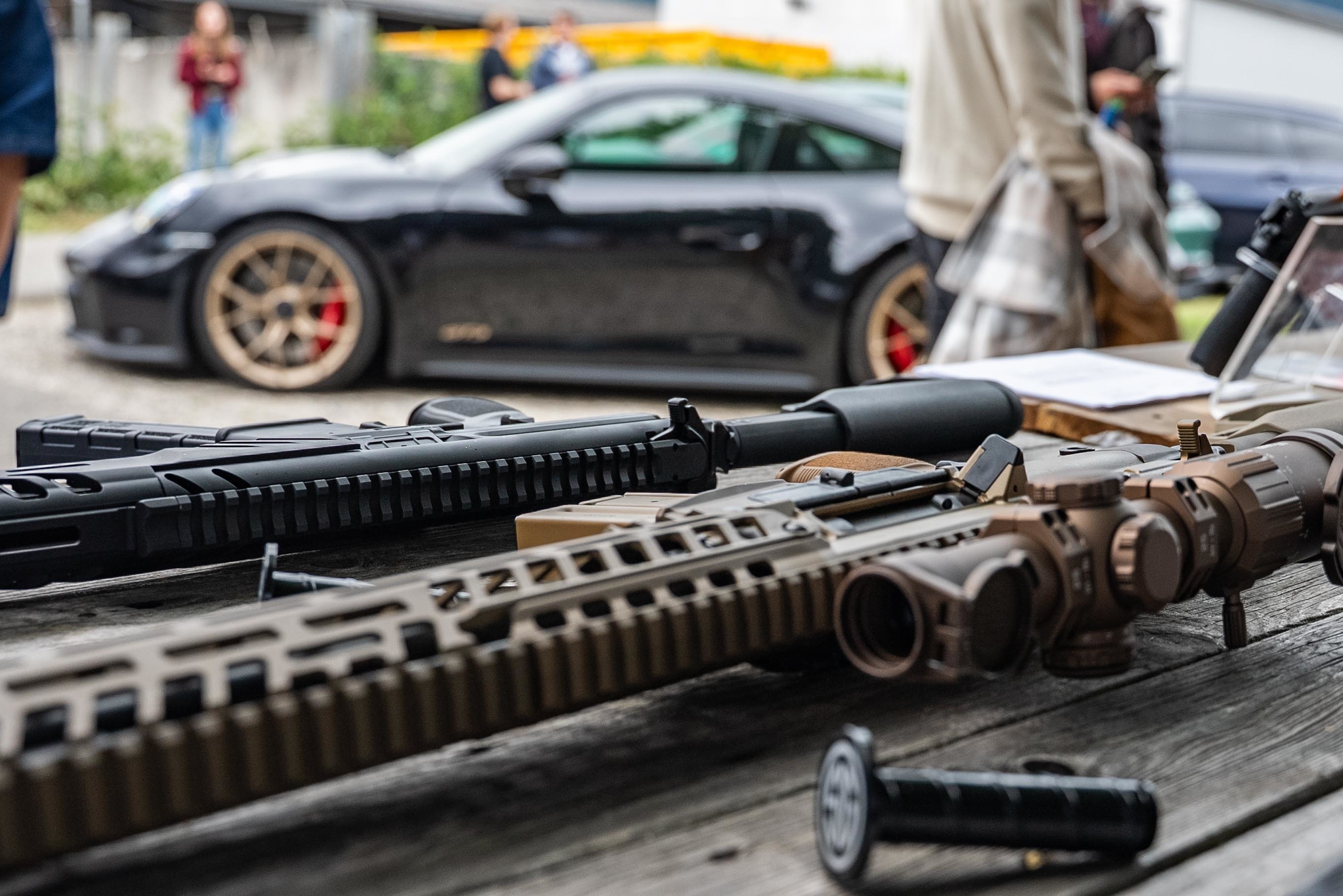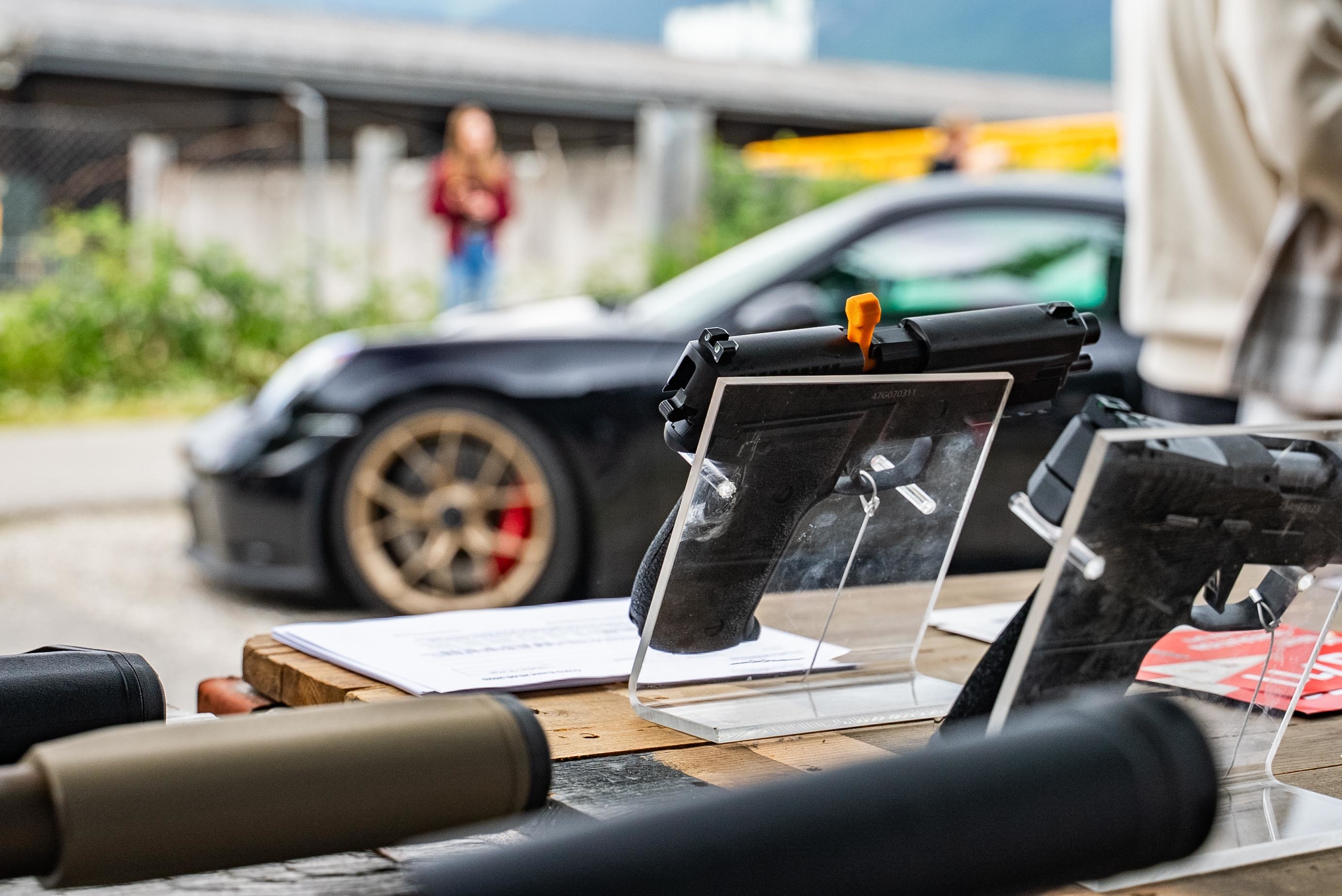 Ce qui se passe là-bas, entre l'asphalte, la fumée de poudre et les odeurs de barbecue, est difficile à décrire avec des mots – il faut le vivre pour le croire. La McLaren roule à côté de la Dodge Charger de Vogel Offroads, une GT3 fait monter les tours, tandis qu'à l'intérieur, sous stricte surveillance, un chargeur Sig Sauer est chargé. Les tirs ont lieu uniquement dans le stand de tir, tout est autorisé, tout est légal, mais l'énergie est palpable. Ceux qui ne connaissent pas cet endroit le sentent immédiatement : ce n'est pas un showroom, c'est réel.